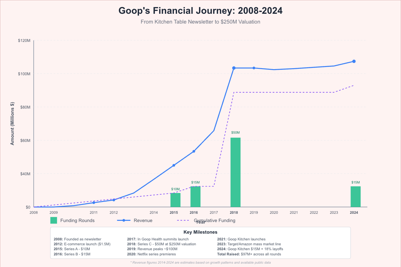 By 2018, after raising a $50 million in Series C, Goop’s valuation hit $250 million. Total funding reached $82 million. The company that started as a weekly email has become one of the most valuable lifestyle brands in the world.